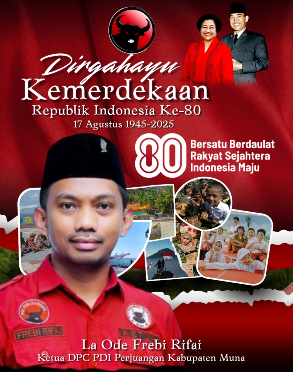 FNEWS.ID, MUNA – Peringatan Hari Ulang Tahun ke-80 Republik Indonesia tahun 2025 dengan tema “Bersatu, Berdaulat, Rakyat Sejahtera, Indonesia Maju” kembali menghadirkan semangat perjuangan yang diwariskan oleh para pendiri bangsa. Ketua DPC PDI Perjuangan Kabupaten Muna, La Ode Frebi Rifai, mengajak seluruh masyarakat untuk menjadikan momentum ini sebagai titik tolak memperkokoh semangat persatuan, memperjuangkan kedaulatan, dan memastikan kesejahteraan rakyat sebagai tujuan utama kemerdekaan.