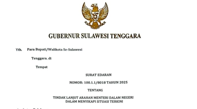 FNEWS.ID, Kendari – Gubernur Sulawesi Tenggara (Sultra) Andi Sumangerukka resmi mengeluarkan Surat Edaran Nomor 100.1.1/8018 Tahun 2025 sebagai tindak lanjut arahan Menteri Dalam Negeri dalam menyikapi dinamika situasi nasional dan daerah. Surat edaran yang ditujukan kepada seluruh bupati/wali kota se-Sultra ini menekankan pentingnya langkah strategis, terukur, dan berpihak pada masyarakat demi menjaga stabilitas daerah. Sabtu (31/8/2025).